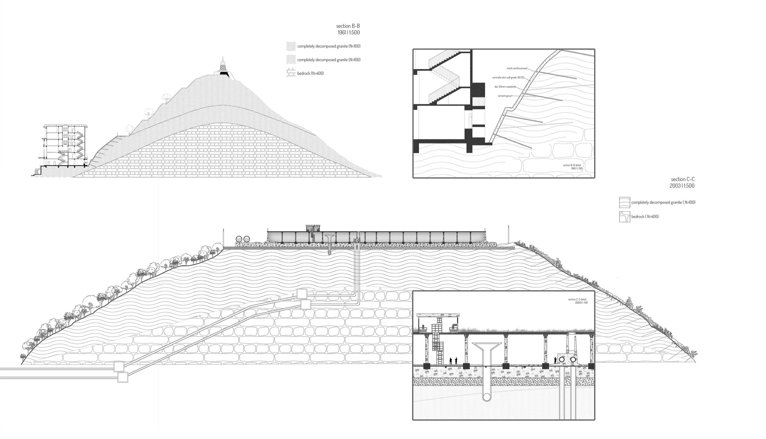“Buildings replace the land. That is architecture’s original sin. The memories that we built up around that particular place also disappear. In their place is a structure that is new, if only for a moment, and that aspires to have a perfect form, function and appearance. In all cases, a building is one thing above all else: not the land.” Garden Hill was heavily equipped with different scales of infrastructure to preserve it from landslides and serve as a water reservoir, inspiring how infrastructure founded itself into the earth and evolved in rapid urbanisation. Eventually, these led to the design of an underground museum meandering between heritage nodes.