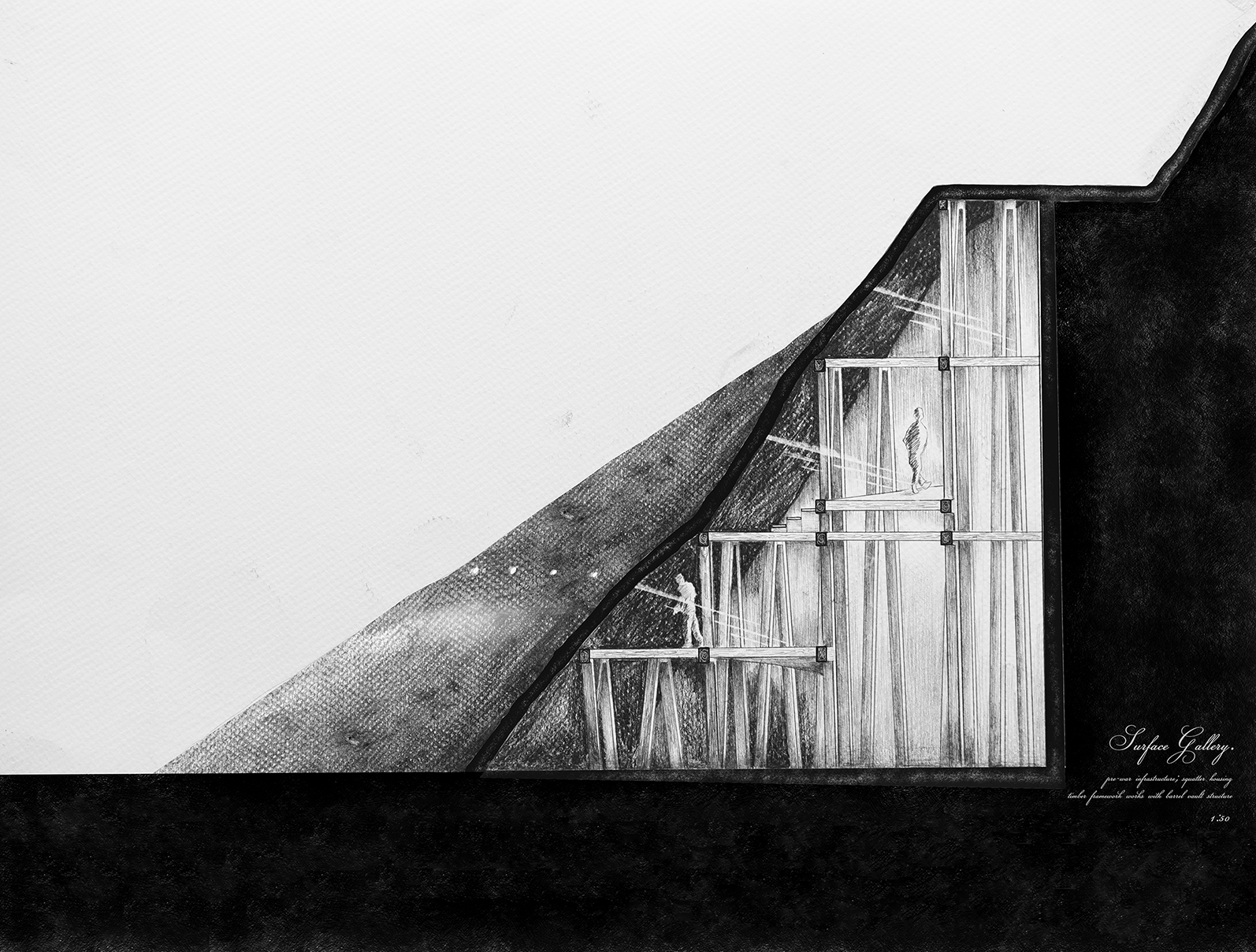 Nowadays, Garden Hill is anchored by three heritage spots: a magistracy at the foot of the hill, a service reservoir hidden near the top of the hill and a sightseeing park at the peak. By examining the slope of the hill and iterating through different spans, we tied up the anchors with a meandering ramp which allows visitors to unveil the geological history of the hill. To propose the structure of this architecture, we used the Gallo- Roman Museum in Lyon and many other retaining structures examples as references. As a result, the underground space was supported by a series of barrel walls on the back and slanted columns along the spine. Meanwhile, the aboveground park was retained by crib walls and hydroseeding, creating a contrast in experience for the visitors.